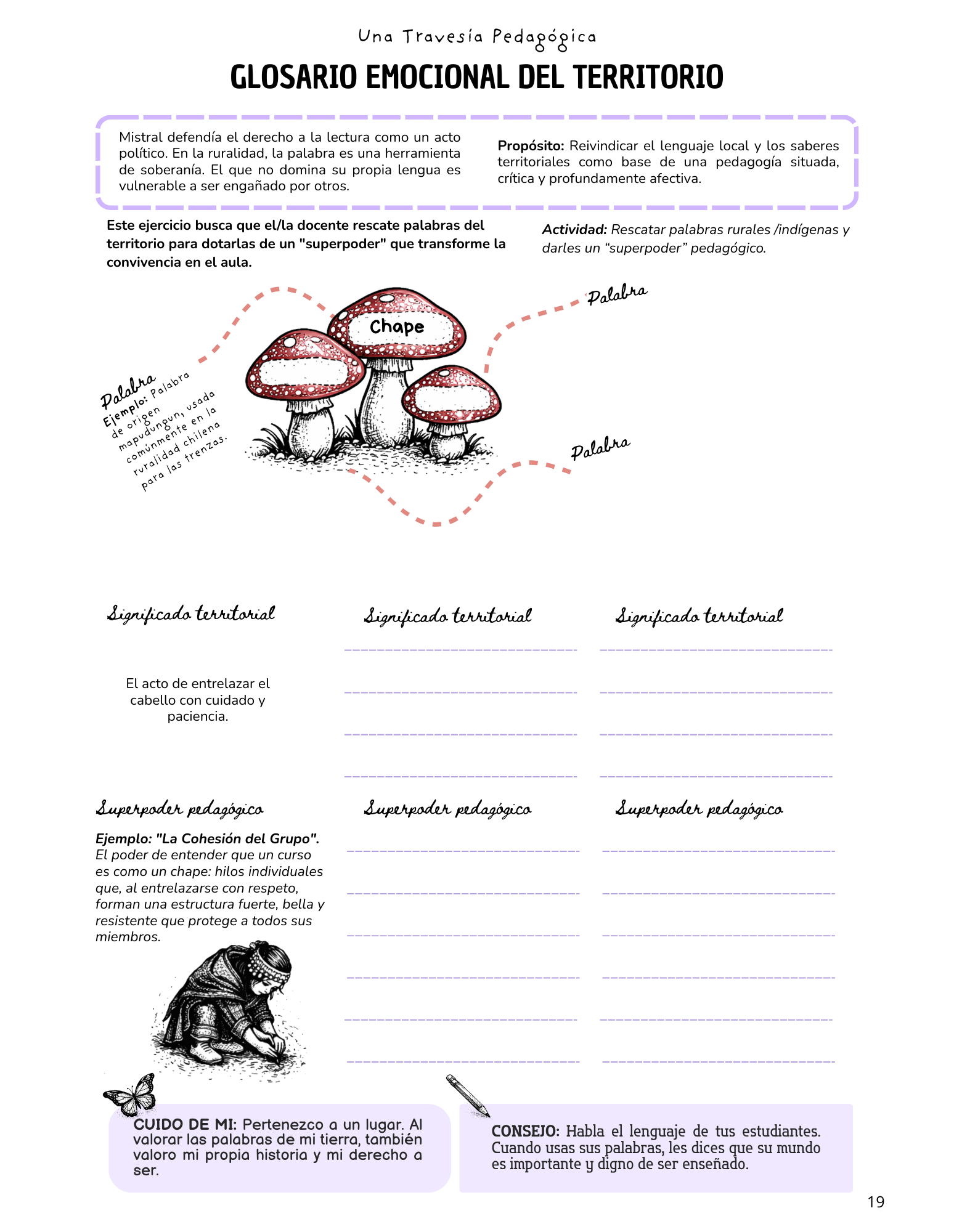 A través de actividades inspiradas en el pensamiento de Gabriela Mistral, Gianni Rodari, María Montessori, Paulo Freire, María Acaso y Francesco Tonnuci, esta bitácora invita a: